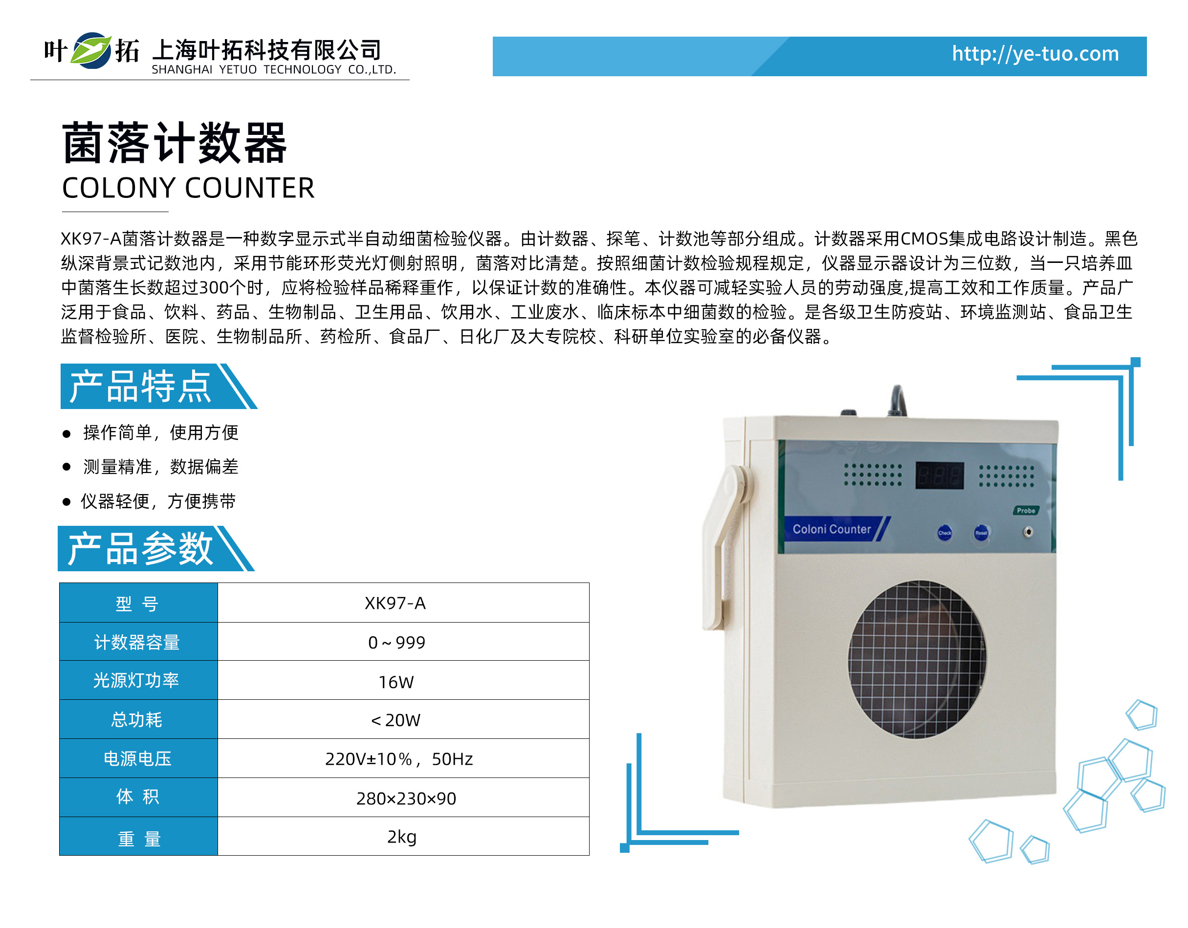 適用范圍:XK97-A菌落計數器是一種數字顯示式半自動細菌檢驗儀器。由計數器、探筆、計數池等部分組成。計數器采用CMOS集成電路設計制造。黑色縱深背景式記數池內,采用節能環形熒光燈側射照明,菌落對比清楚。按照細菌計數檢驗規程規定,儀器顯示器設計為三位數,當一只培養皿中菌落生長數超過300個時,應將檢驗樣品稀釋重作,以保證計數的準確性。本儀器可減輕實驗人員的勞動強度,提高工效和工作質量。產品廣泛用于食品、飲料、藥品、生物制品、衛生用品、飲用水、工業廢水、臨床標本中細菌數的檢驗。是各級衛生防疫站、環境監測站、食品衛生監督檢驗所、醫院、生物制品所、藥檢所、食品廠、日化廠及大專院校、科研單位實驗室的必備儀器。
